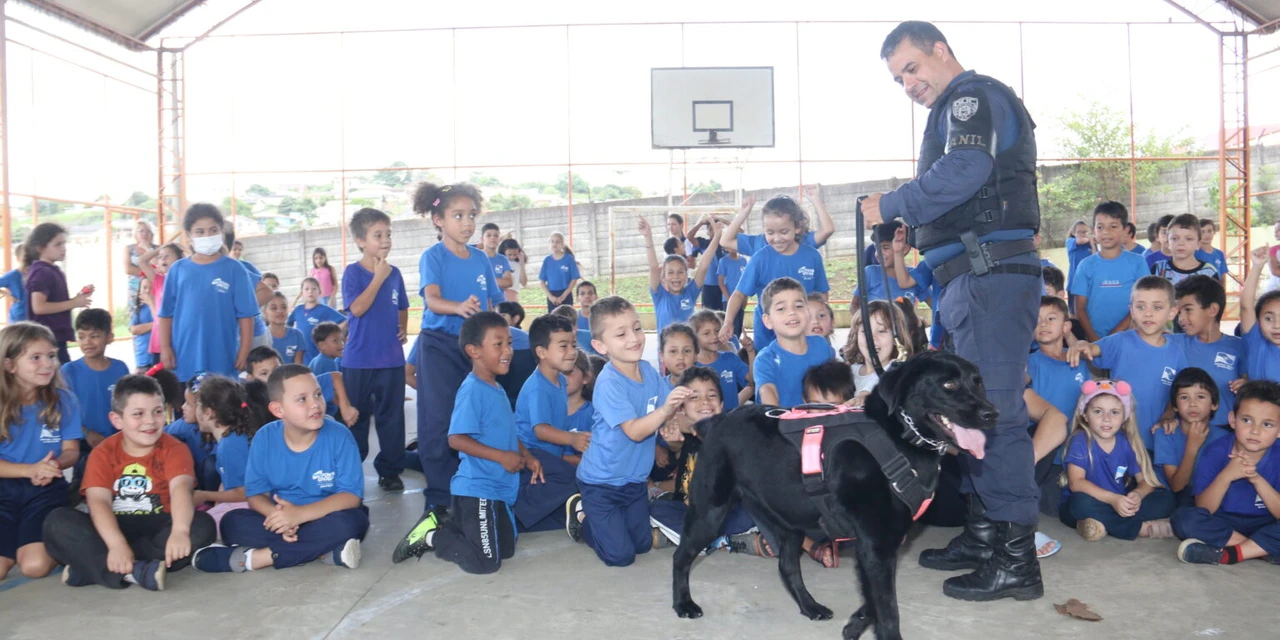 COM ASSESSORIAS - Os agentes apresentaram aos alunos da escola os cães farejadores que compõem o Canil da Guarda Municipal. A ação contou com demonstrações de abordagem e de adestramento. Com direito à carinho e até fotos com os animais, as crianças puderam conhecer os detalhes de como se dá a atuação das unidades caninas da Guarda.