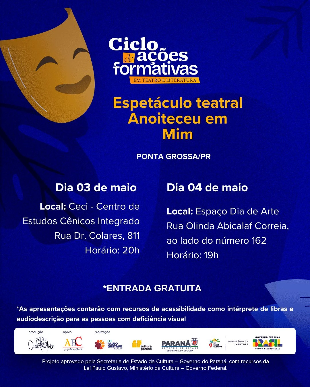 O Ciclo de Ações Formativas é uma produção do Grupo de Teatro Dia de Arte, com apoio da ABC Projetos Culturais. O projeto foi aprovado pela Secretaria de Estado da Cultura do Governo do Paraná, com recursos da Lei Paulo Gustavo, do Ministério da Cultura do Governo Federal.