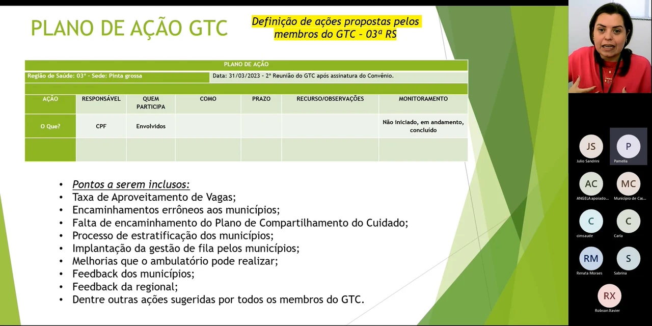 A taxa de aproveitamento das consultas, os encaminhamentos de paciente, os Planos de Cuidado, os processos de estratificação, e a gestão de filas compõem a pauta mínima proposta. “Além destas questões, os gestores irão analisar o que podemos incluir conforme as necessidades dos municípios”, antecipou a diretora. Para isso, nos próximos meses, gestores municipais, Regional de Saúde, Conselhos de Secretários e CimSaúde, irão definir pautas para que o Plano de Ação seja adequado à realidade regional.