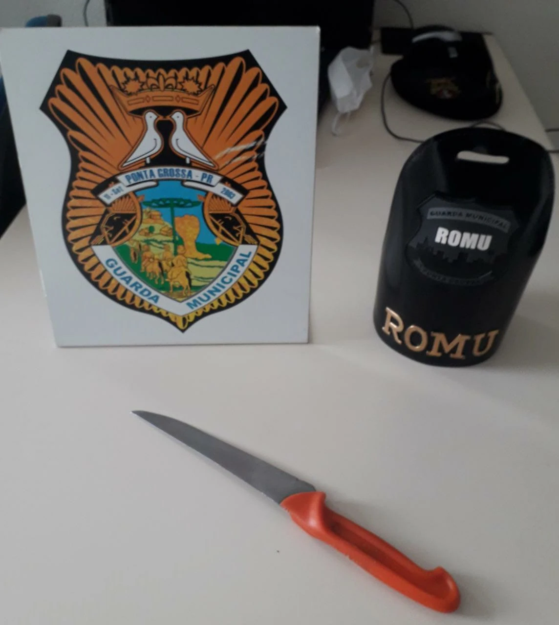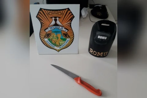 De posse das características do autor - identificado como T.G de 30 anos -, a equipe realizou deslocamento e localizou o cidadão com a faca em mãos nas proximidades da residência.