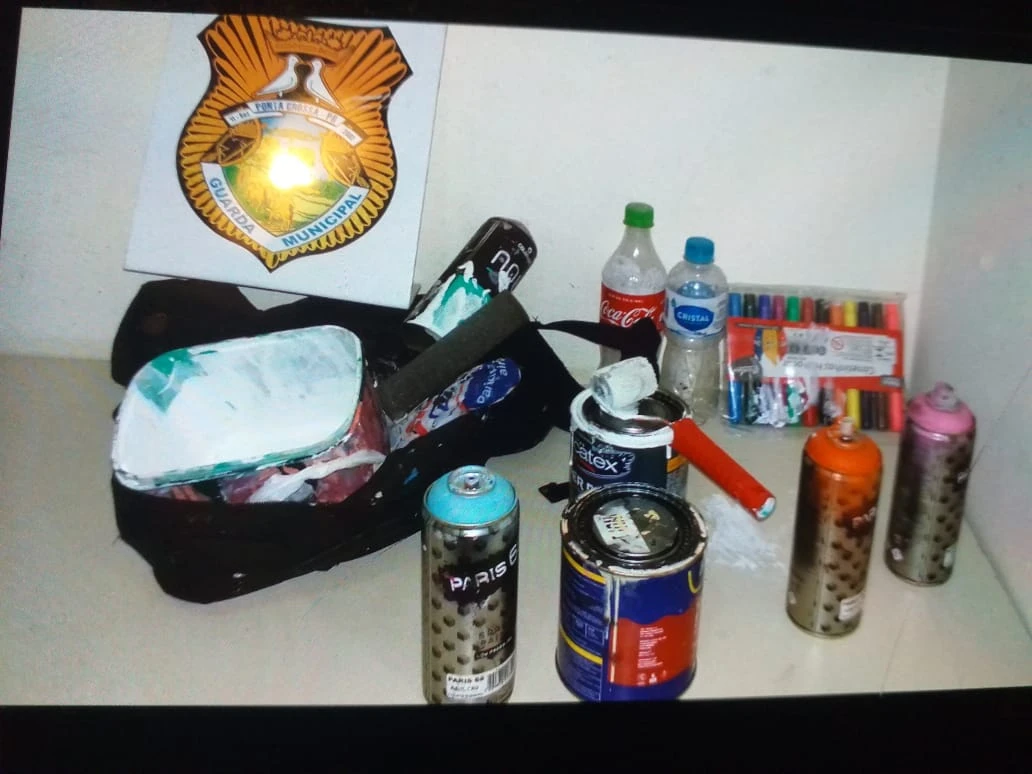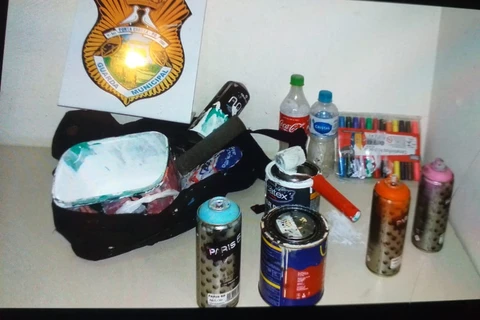 Ao indagar os suspeitos sobre a procedência do material, eles afirmaram serem donos das tintas e responsáveis pela pichação, que teria sido feita minutos antes da chegada da equipe.