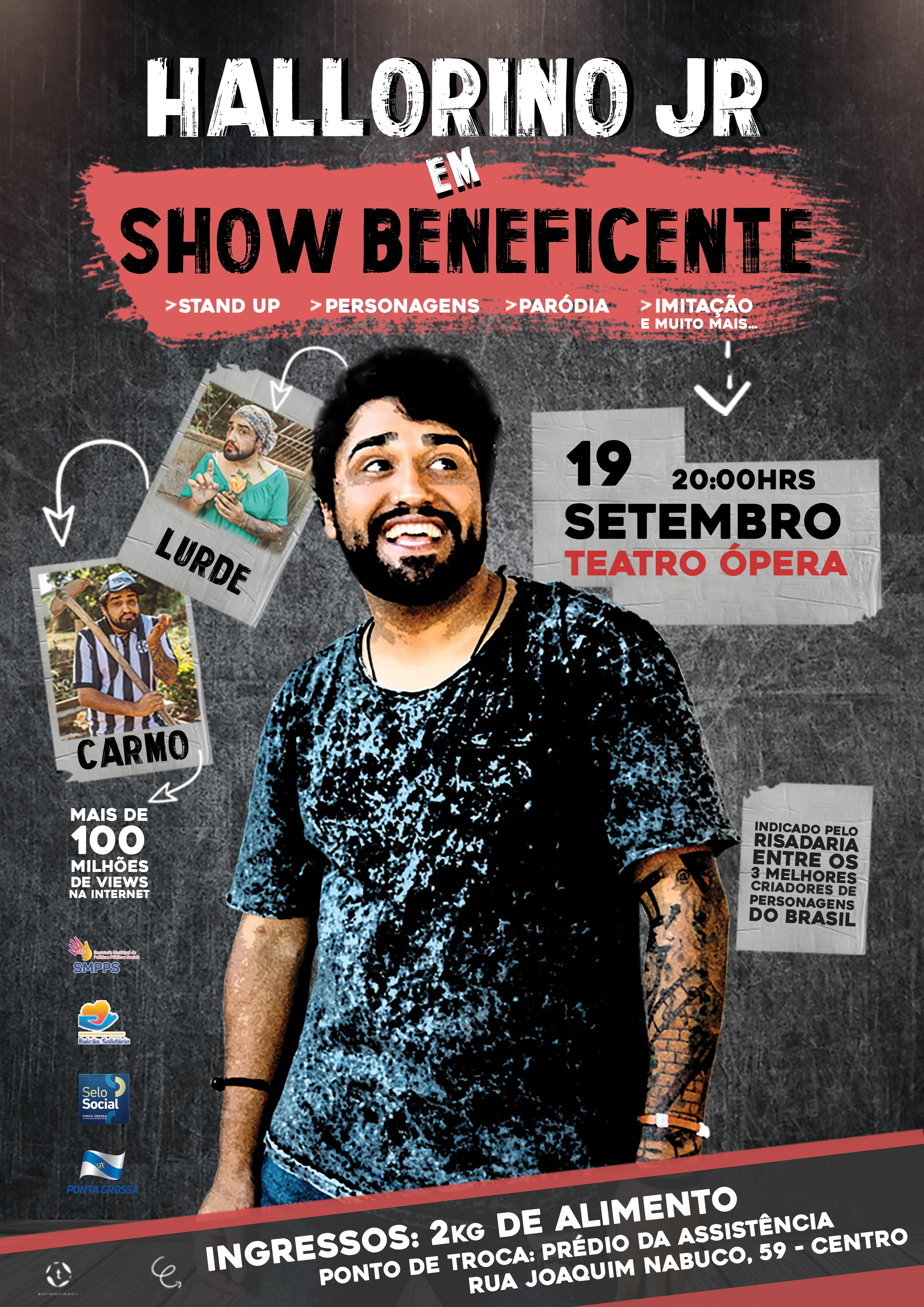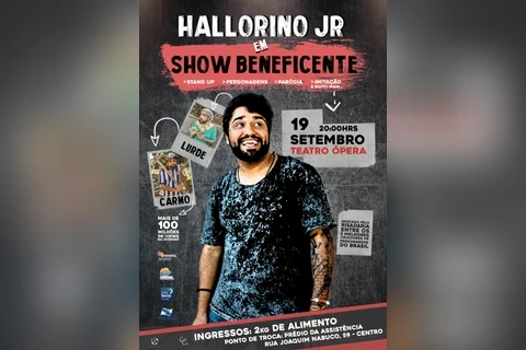 Ana Bitencourt Maravieski/Ponta Grossa - Amanhã (19) o humorista Hallorino Jr fará um show beneficente no Cine Teatro Ópera, às 20 horas. A iniciativa é mais uma ação do projeto Balcão Solidário. Os ingressos podem ser trocados por dois quilos de alimentos não perecíveis no prédio da Secretaria Municipal de Políticas Públicas Sociais (SMPPS) – rua Joaquim Nabuco, 59 –. Os materiais arrecadados serão entregues às famílias em vulnerabilidade social, cadastradas nos Centros de Referência de Assistência Social (CRAS).