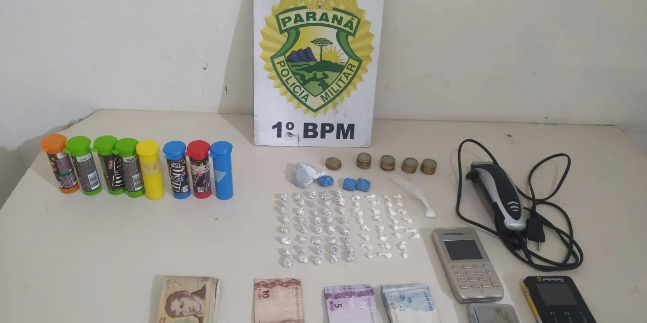 Durante revista pessoal, com um deles os policiais encontraram algumas porções de droga e constataram que o homem vendia os entorpecentes. A equipe seguiu então até a residência do abordado e localizou 40 pedras de crack, 31 embalagens com cocaína, 4 embalagens com maconha, dinheiro, balança de precisão e uma máquina de cartão de crédito.