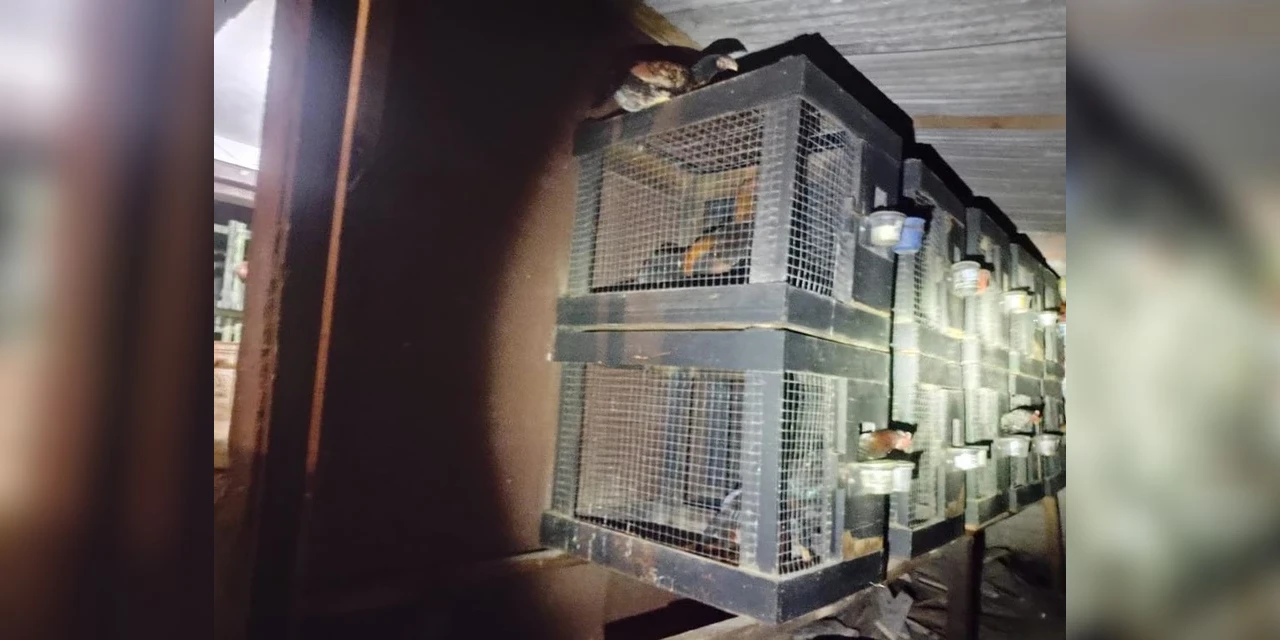 Segundo a PM, no local foram encontradas diversas gaiolas pelas paredes, com um total de 63 galos e quatro pássaros silvestres.