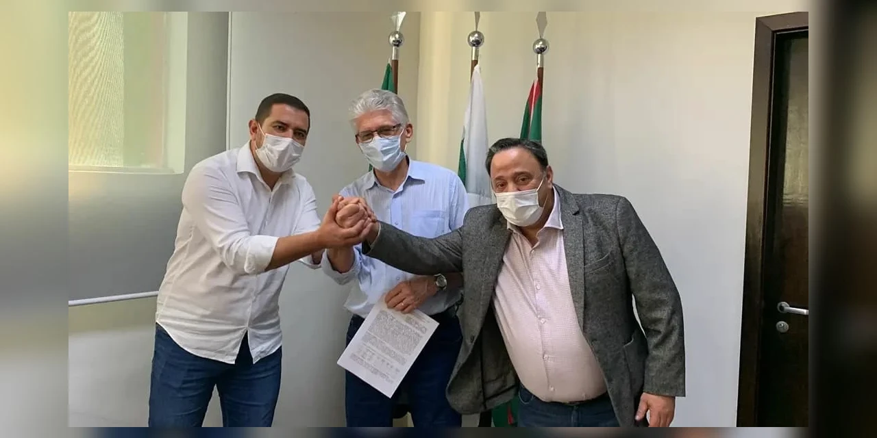 COM ASSESSORIAS - O deputado Hussein Bakri, o secretário de Estado da Agricultura, Norberto Ortigara, e o prefeito Abimael do Valle assinaram convênio de 10km de pavimentação poliédrica rural para São João do Triunfo.