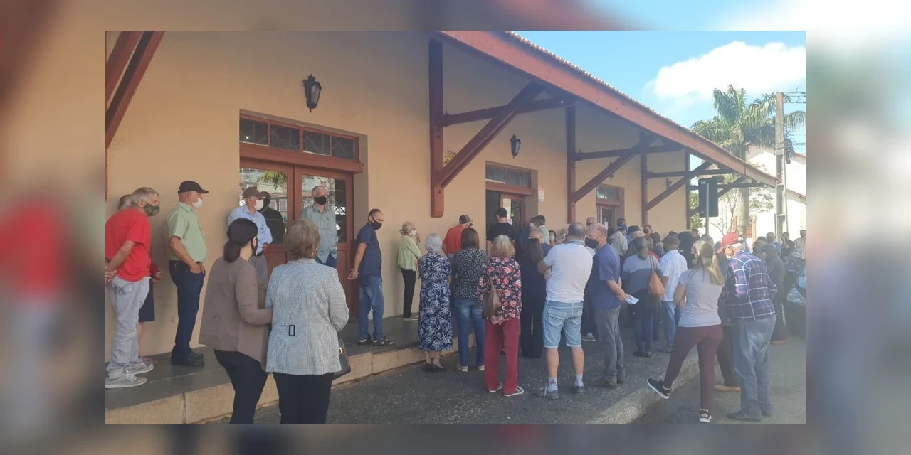 Idosos enfrentam fila para receber a segunda dose da vacina contra a Covid-19 em Ponta Grossa, nos Campos Gerais do Paraná, na manhã desta quarta-feira (31). A Guarda Municipal está na Estação Arte para organizar a fila.