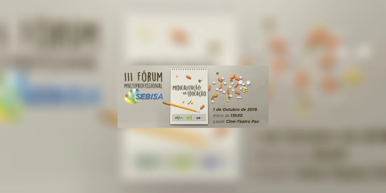 Mari Cleia Aparecida de Andrade/UEPG - O Setor de Ciências Biológicas e da Saúde - SEBISA, promove em 1° de outubro de 2018 às 13h30, no Cine Teatro Pax, o III Fórum Multiprofissional SEBISA. Com o tema 'Medicalização na Educação', o evento está sendo programado através de uma comissão setorial composta por professores dos cursos participantes, bem como dos acadêmicos envolvidos com os centros acadêmicos. O Fórum tem objetivo de discutir o processo saúde doença e a utilização de medicamentos e drogas para a melhoria do aprendizado.