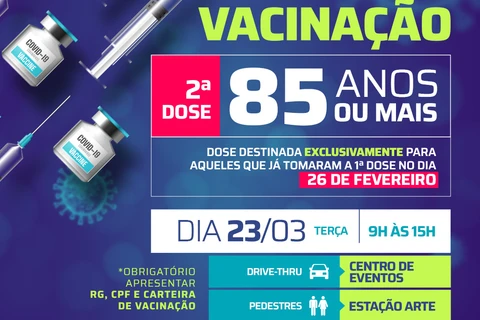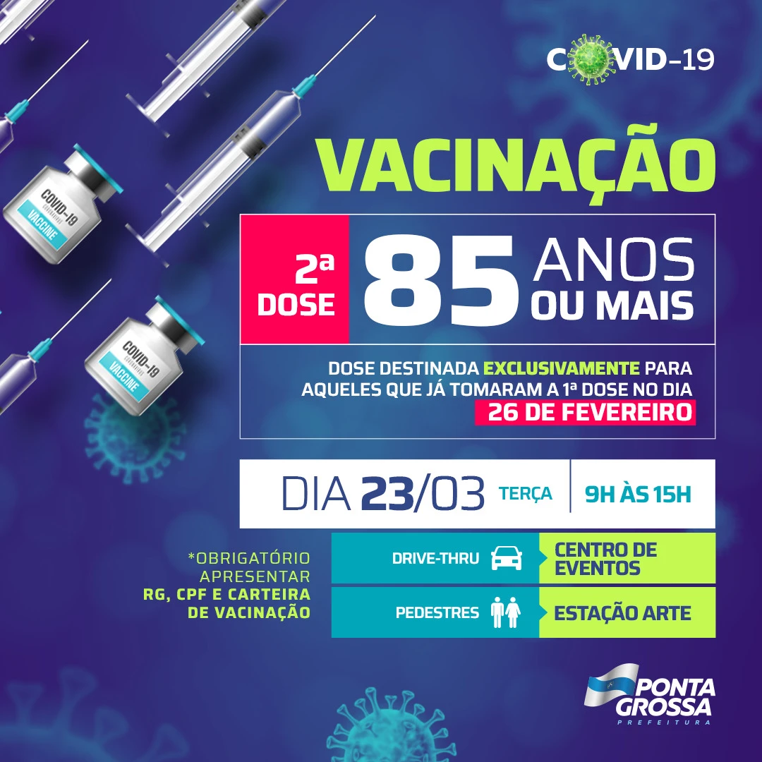 COM ASSESSORIAS - Amanhã (23), a Prefeitura de Ponta Grossa, através da Fundação Municipal de Saúde (FMS), fará a aplicação da 2ª dose da vacina contra coronavírus. O público que deve comparecer nos locais e horários estipulados são os idosos de 85 anos ou mais que se imunizaram no dia 26/02.