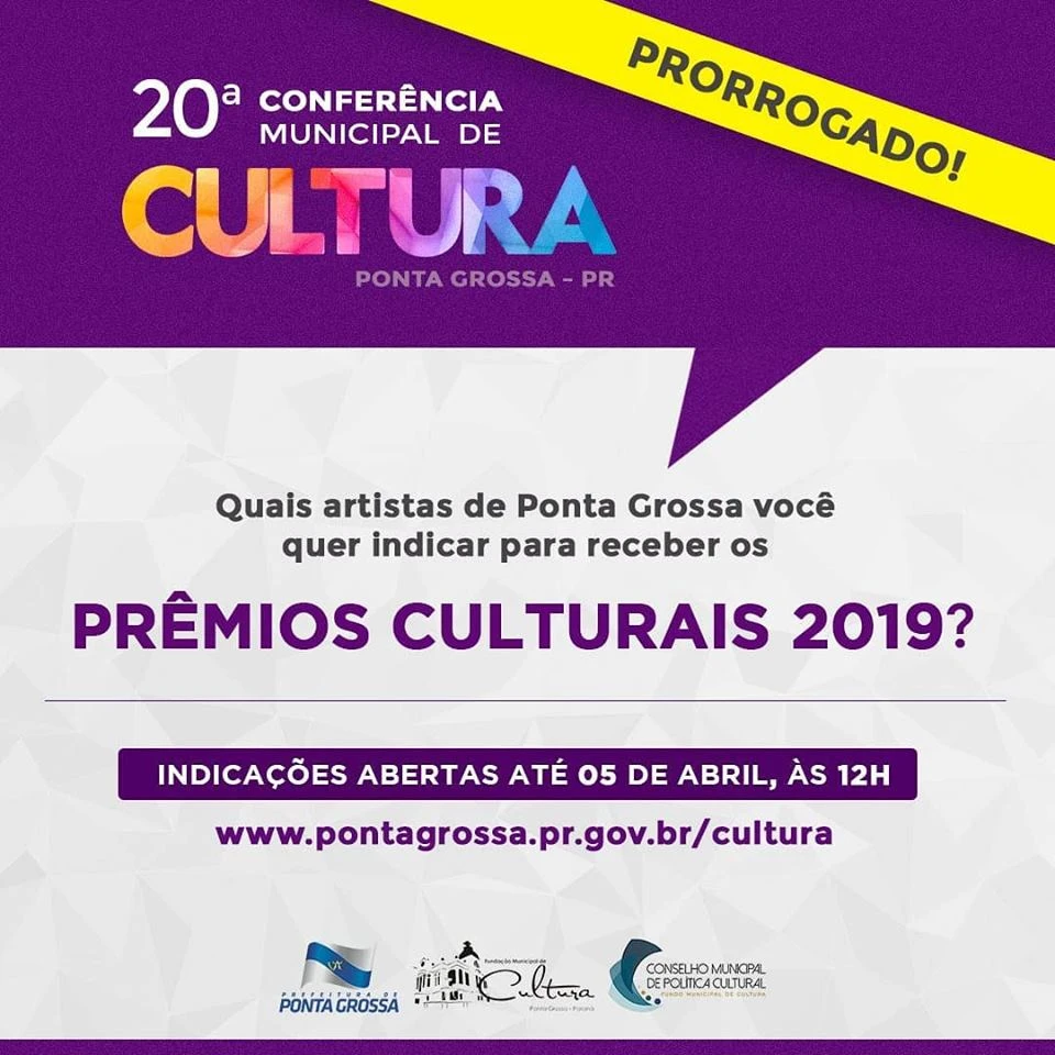 Luana Caroline Nascimento/Ponta Grossa - Foram prorrogadas até sexta-feira, 05 de abril, às 12h, o prazo para as indicações aos Prêmios Culturais 2019, um reconhecimento da Prefeitura de Ponta Grossa, da Fundação Municipal de Cultura e do Conselho Municipal de Política Cultural às pessoas que se destacaram em diferentes setores culturais durante o ano de 2018. O formulário para sugestão de homenageados está disponível no link