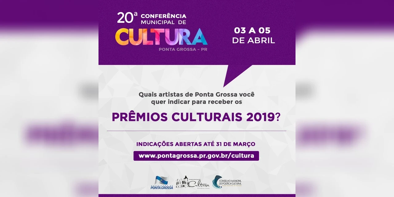 Luana Caroline Nascimento/Ponta Grossa - Está aberto até o dia 31 de março o formulário de indicações para a definição dos homenageados com os Prêmios Culturais 2019, um reconhecimento da Prefeitura de Ponta Grossa e da Fundação Municipal de Cultura às pessoas que se destacaram em diferentes setores culturais durante o ano de 2018. A comunidade poderá sugerir nomes, justificando a sua importância para o setor cultural de Ponta Grossa no ano de 2018 (ou pelo conjunto da obra). O formulário para indicação esta no site da Prefeitura (