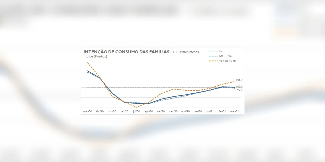 As famílias com renda acima de dez salários mínimos têm impulsionado a alta do ICF, que segue em crescimento, atingindo 105,7 pontos em março, com alta de 2,4% na variação mensal. Já entre as famílias de menor renda, o fim do auxílio emergencial tem restringido os gastos e fez o índice voltar ao patamar negativo neste mês, com 99,1 pontos.