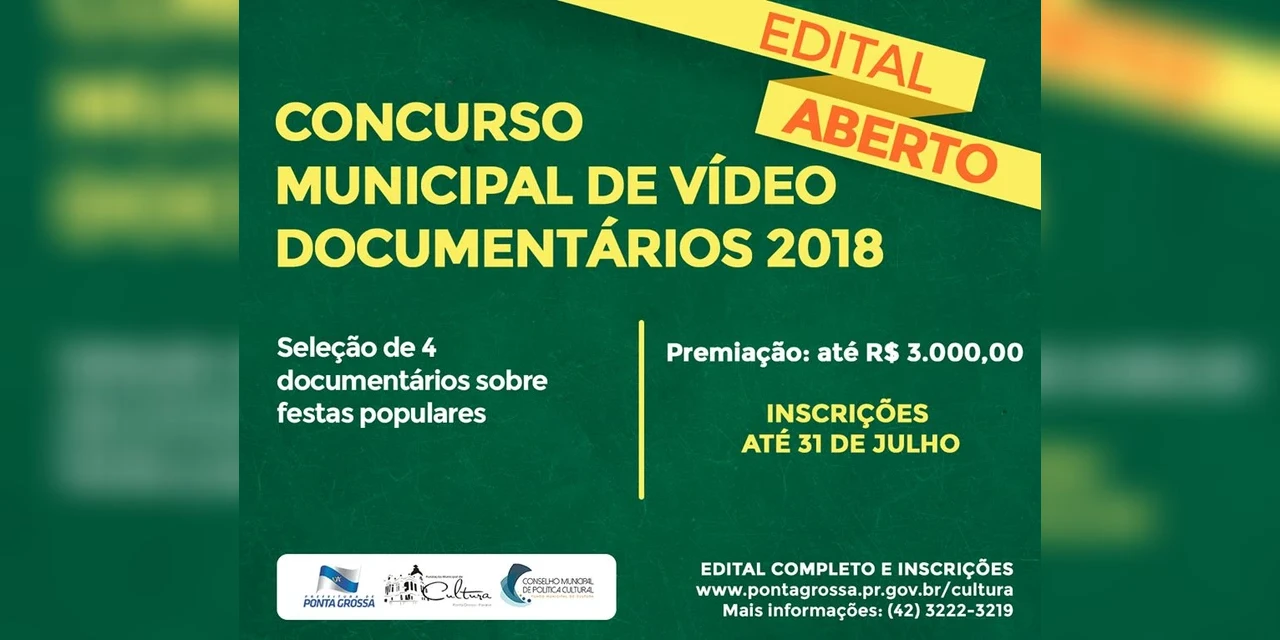 IMPRENSA/Ponta Grossa - Até o dia 31 de julho, os interessados em participar do Concurso Municipal de Vídeo Documentários 2018 podem realizar suas inscrições. O tema do concurso deste ano são as festas populares em Ponta Grossa e Campos Gerais. Serão distribuídos R$ 9 mil em premiação, com recursos do Fundo Municipal de Cultura. O edital é realizado pela Prefeitura de Ponta Grossa, por meio da Fundação Municipal de Cultura, e pelo Conselho Municipal de Política Cultural.