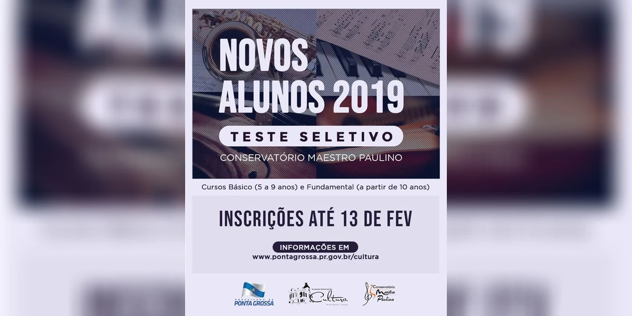 www.pontagrossa.pr.gov.br/cultura) e entrega-la preenchida na secretaria do Conservatório, até o dia 13 de fevereiro, no horário das 9h às 12h e das 13h às 18h. A inscrição para o teste seletivo custa R$ 35 e o valor deverá ser pago por meio de depósito identificado, entregando uma cópia do comprovante juntamente com a ficha de inscrição (importante se atentar para inserir o número do CPF no momento do depósito, para identifica-lo).