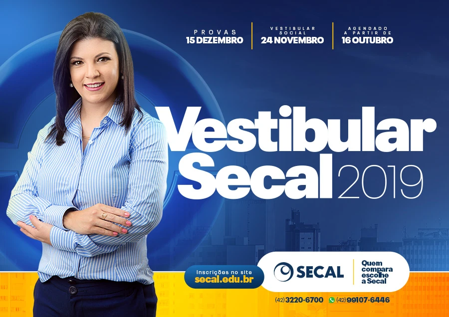 Sendo a Instituição de Ensino Superior Privado (IES) mais tradicional da cidade de Ponta Grossa, o ‘Vestibular Secal 2019’ oferece as seguintes modalidades para os candidatos, que concorrerão a vagas nas graduações de Administração, Ciências Contábeis, Direito, Jornalismo, Gestão de Produção Industrial, Gestão de Recursos Humanos, Letras e Pedagogia: