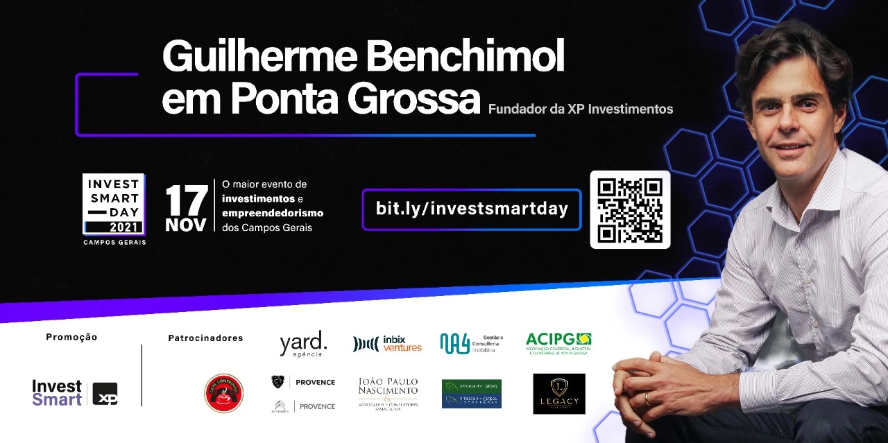 COM ASSESSORIAS - A InvestSmart, escritório da XP Investimentos em Ponta Grossa, realiza no dia 17 de novembro o InvestSmart Day 2021 Campos Gerais, cuja grande atração será Guilherme Benchimol, fundador da XP Investimentos. O evento será na sede campestre do Clube Ponta Lagoa, e as inscrições já estão abertas.
