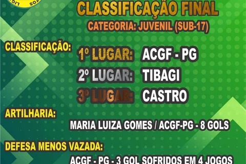Com moral após o vice-campeonato dos Jogos da Juventude do Paraná, o elenco sub-17 da ACGF/Prefeitura de Ponta Grossa - sob o comando do professor Diogo Augusto - se impôs mais uma vez e faturou o título da 2ª etapa na Liga Sul-Norte após superar a equipe de Tibagi por 3 a 1; nos prêmios individuais, Maria Degraf foi o destaque e terminou como artilharia da etapa com oito gols, enquanto Tyffany foi a melhor goleira. Além do ataque poderoso, as meninas da ACGF também mostraram força na marcação e terminaram com as defesas menos vazadas nas três categorias.