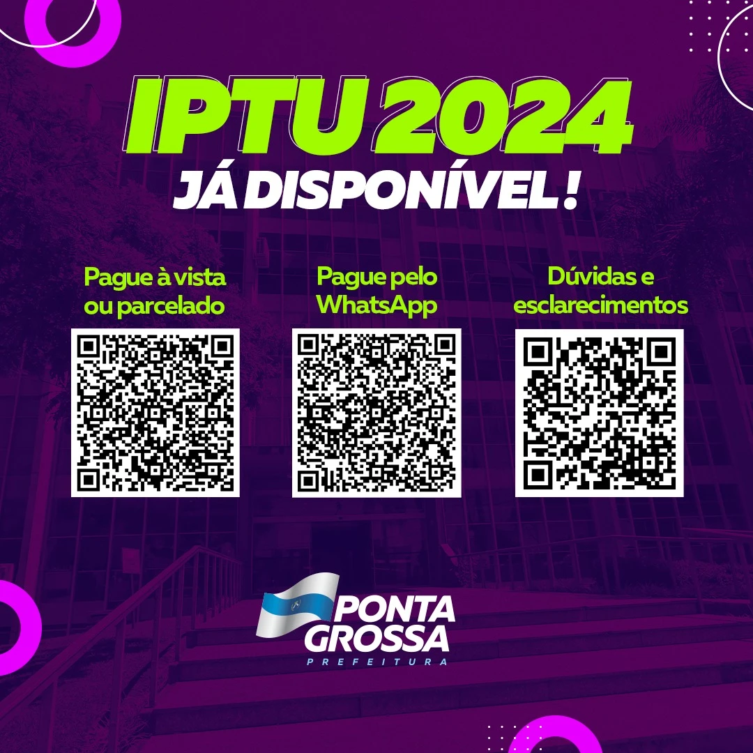 COM ASSESSORIAS - A Prefeitura de Ponta Grossa, por meio da Secretaria da Fazenda, reforça aos contribuintes que não haverá entrega de carnês do IPTU 2024 pelos Correios como de costume. Os boletos para o pagamento do tributo ficarão disponíveis via internet, podendo ser gerados por meio do site da Prefeitura ou pelo Whatsapp. O contribuinte que fizer o pagamento à vista terá desconto de 15% no valor total, o maior desconto da história.