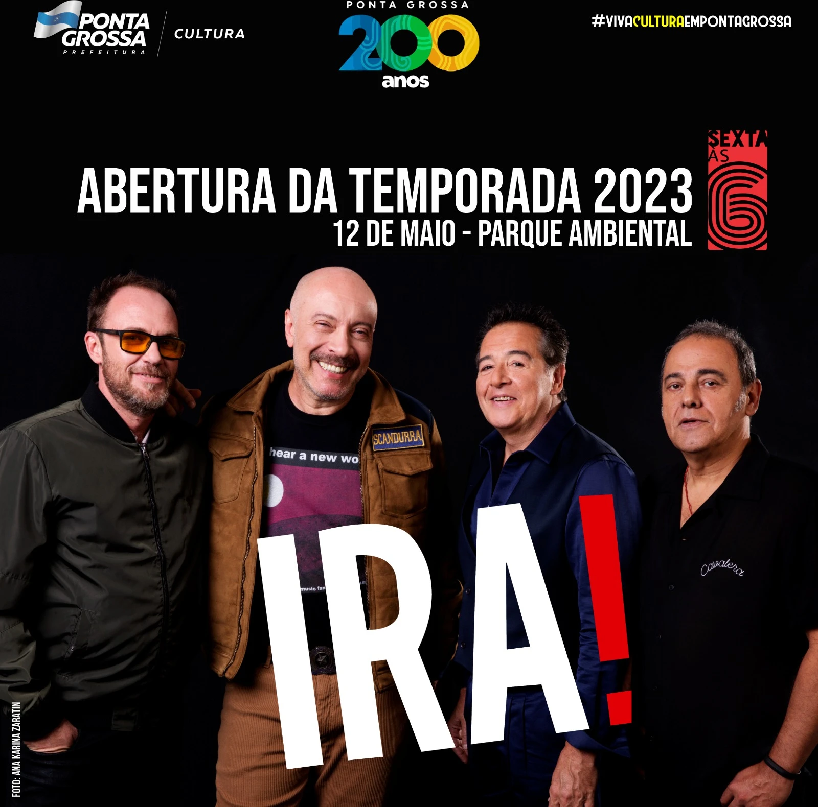 COM ASSESSORIAS - O icônico palco do Sexta às Seis, que já teve nomes como Ratos do Porão, Lobão, Angra, Casa das Máquinas e Blindagem, recebe agora o Ira! A banda paulistana, que tem mais de 40 anos de estrada, é a convidada para a abertura da temporada 2023 do Projeto. A apresentação acontece no dia 12 de maio, no Parque Ambiental. A promoção é da Prefeitura de Ponta Grossa, através da Secretaria Municipal de Cultura, e faz parte da programação dos 200 anos de Ponta Grossa.
