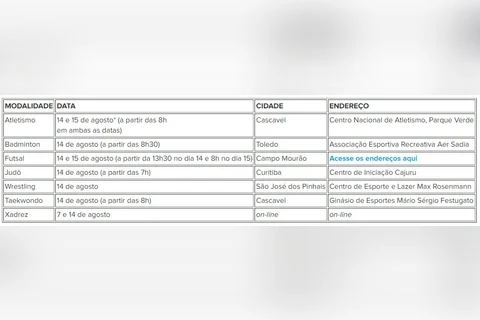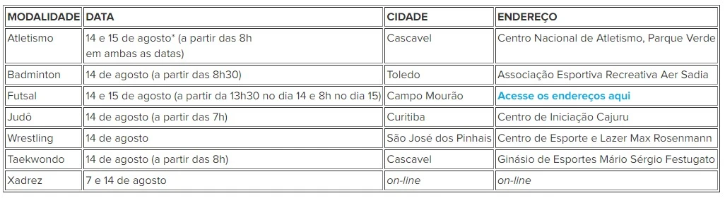 As modalidades terão suas respectivas federações atuando com o apoio do Governo do Paraná na organização, além da parceria da Federação do Desporto Escolar do Paraná (FDE-PR).