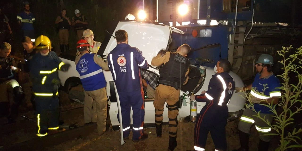 De acordo com informações de testemunhas, o veículo estava atravessando o trilho do trem quando foi atingido pela locomotiva. Os bombeiros tiveram um grande trabalho para tirar o motorista do automóvel, já que ele ficou preso nas ferragens. O jovem, de 23 anos, foi levado para o Hospital Regional com ferimentos graves.