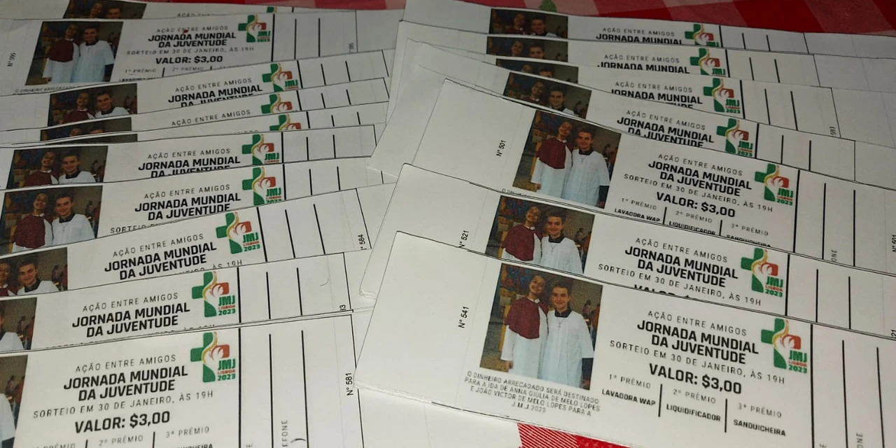 Um deles é o dos irmãos Anna Giulia e João Victor de Melo Lopes, que estão prestes a realizar um sonho. “Temos apenas algumas semanas para concluir a arrecadação de fundos em prol da Jornada Mundial da Juventude 2023. Contamos com a sua colaboração para nos ajudar a concretizá-lo. Que tal você fazer parte dessa etapa das nossas vidas? ”, diz o texto da mensagem enviada pelo WhatsApp que divulga a ação entre amigos. O objetivo é obter R$ 24 mil para a viagem. Desses, R$ 6 mil eles já têm em caixa. A ‘rifa’ oferece cada número a R$ 3, ou, blocos de 20 bilhetes a R$ 60. São três prêmios: lavadora de alta pressão (1º lugar), liquidificador (2º) e sanduicheira (3º).