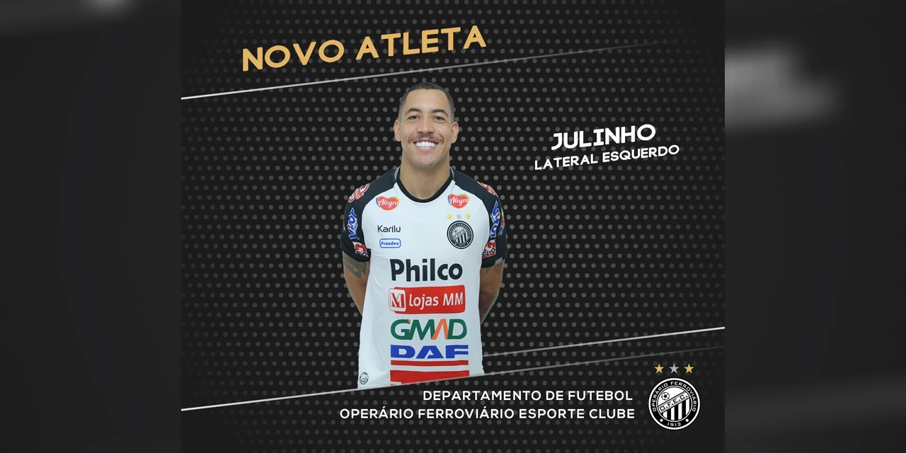 COM ASSESSORIAS - O Operário Ferroviário anunciou, na tarde desta terça-feira (18), a chegada do lateral esquerdo Julinho, de 33 anos. O jogador passará por exames médicos e demais procedimentos do clube e será apresentado na sequência. Julinho passou pelo Fantasma em 2015, quando o time foi Campeão Paranaense.