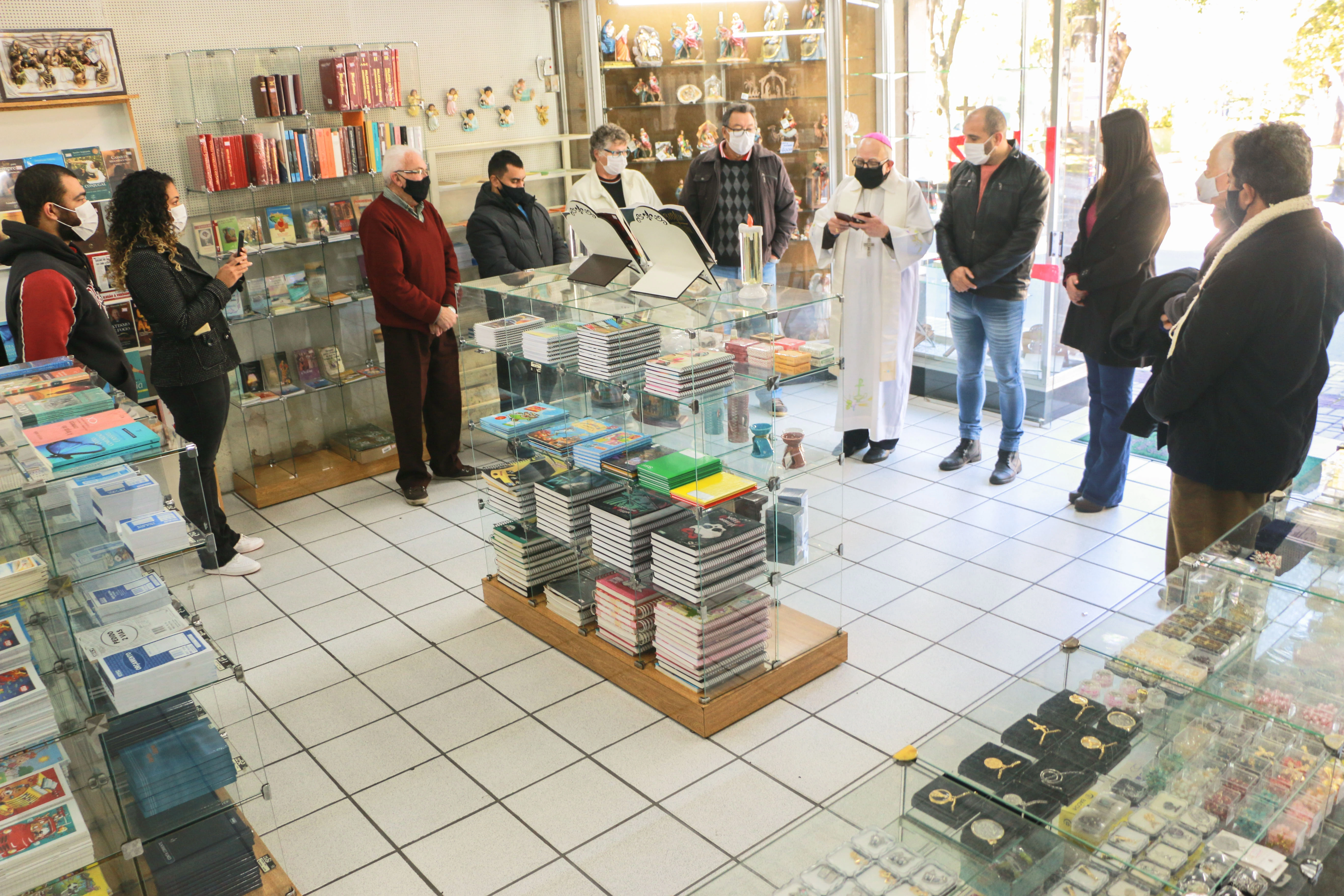 COM ASSESSORIAS - Nesta sexta-feira (30), às 9 horas, aconteceu a reinauguração da Livraria São Luiz, tradicional ponto de venda de artigos católicos localizado na Praça Barão do Rio Branco. Com 75 anos de funcionamento, a livraria passa, a partir de agora, a ser administrada por um ex-funcionário, Fábio Luciano Cavilha, que trabalhou ali 31 anos e comprou as instalações dos padres da Congregação dos Missionários do Verbo Divino, responsáveis até então pela gestão do local. O bispo dom Sergio Arthur Braschi acompanhou a cerimônia de reinauguração.