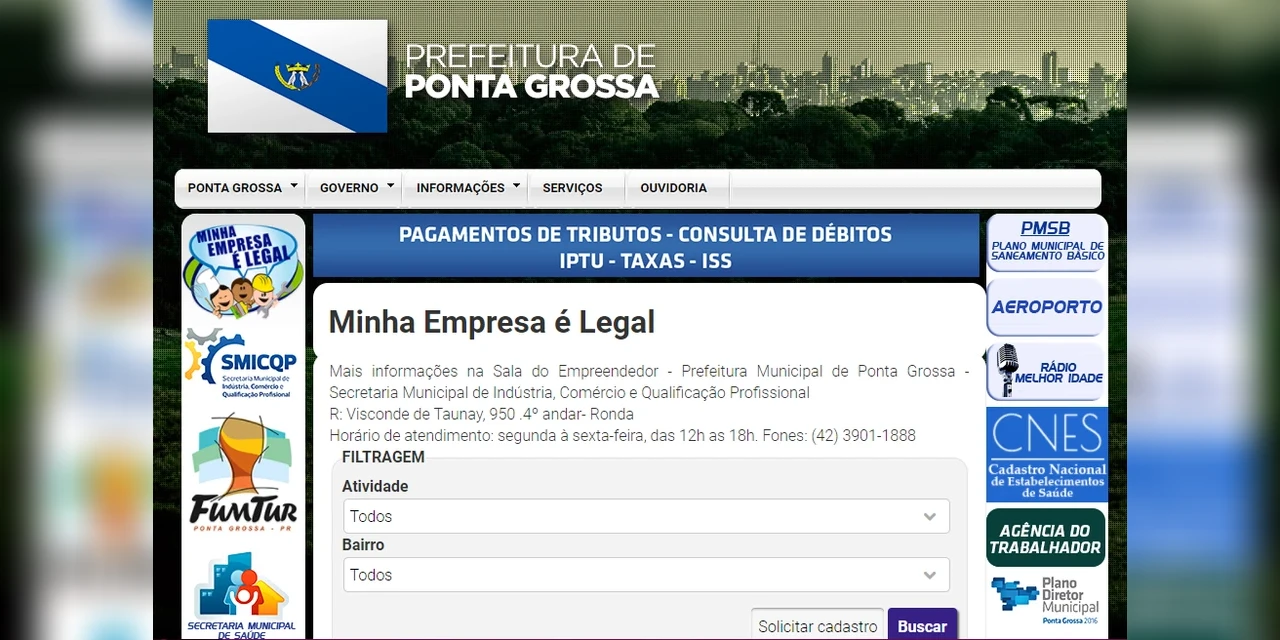 Serviço - O Minha Empresa é Legal está disponível no site da Prefeitura no primeiro ícone da coluna esquerda, ou diretamente pelo endereço http://www.pontagrossa.pr.gov.br/mei/busca. Para mais informações, o telefone da Sala do Empreendedor é 3220-1888. O horário de atendimento é das 12 às 17 horas, no andar térreo do Paço Municipal (Av. Visconde de Taunay, 950 – Ronda).