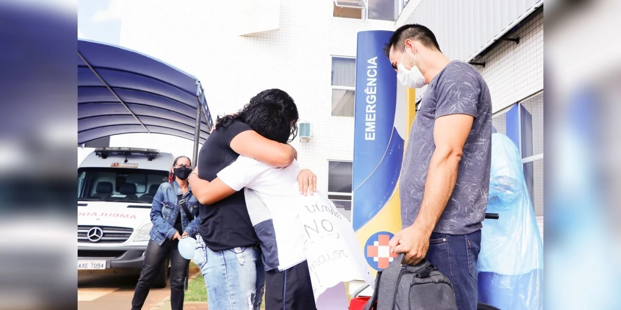 Ao receber alta, na porta do HU, Breno reencontrou a família entre abraços e lágrimas.