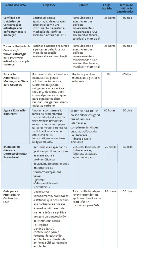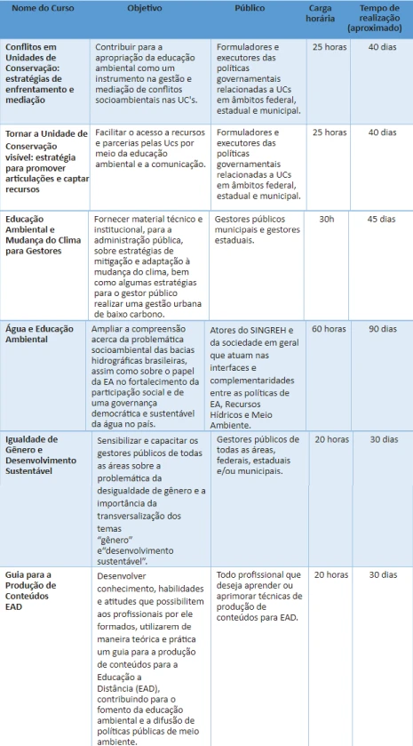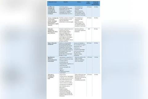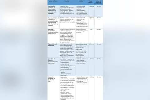 São duas mil vagas em seis cursos autoinstrucionais (sem tutoria) sobre Educação Ambiental; Unidades de Conservação; Igualdade de Gênero e desenvolvimento sustentável; e Produção de conteúdo.