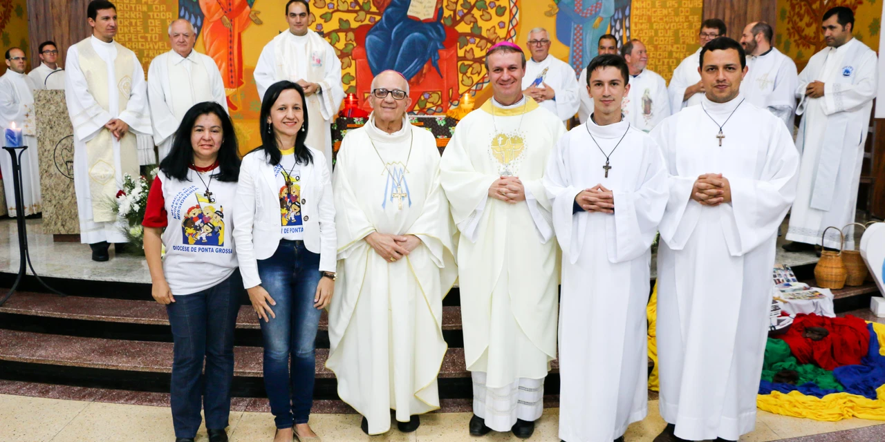 COM ASSESSORIAS - Na mesma cerimônia que acolheu os missionários Pedro e Salete Lang, na última quarta-feira (31), o bispo dom Sergio Arthur Braschi fez o envio de quatro missionários da Diocese para a Prelazia de Lábrea, no Amazonas. Quatro missionários da Diocese de Ponta Grossa ficarão na Prelazia de Lábrea dos dias 18 de dezembro a 17 de janeiro. Viajam para a Amazônia a coordenadora do Conselho Missionário Diocesano, Neuci Marques de Jesus; a coordenadora diocesana da Infância Missionária, Sueli Aparecida Guimarães, e os seminaristas Jeferson Davi Sviercoski Sanches e Gabriel Pereira Freytag.