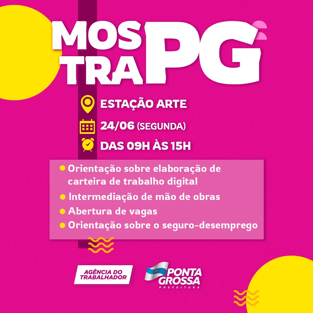 COM ASSESSORIAS - Acontece nesta segunda-feira (24) o "Mostra PG", evento que promove a apresentação dos serviços prestados pela Prefeitura de Ponta Grossa a fim de dar suporte ao trabalhador na busca por oportunidade de emprego. A atividade vai ocorrer em conjunto com outros serviços. O início está agendado para 9h, seguindo até às 15h, na Estação Arte, no Centro.