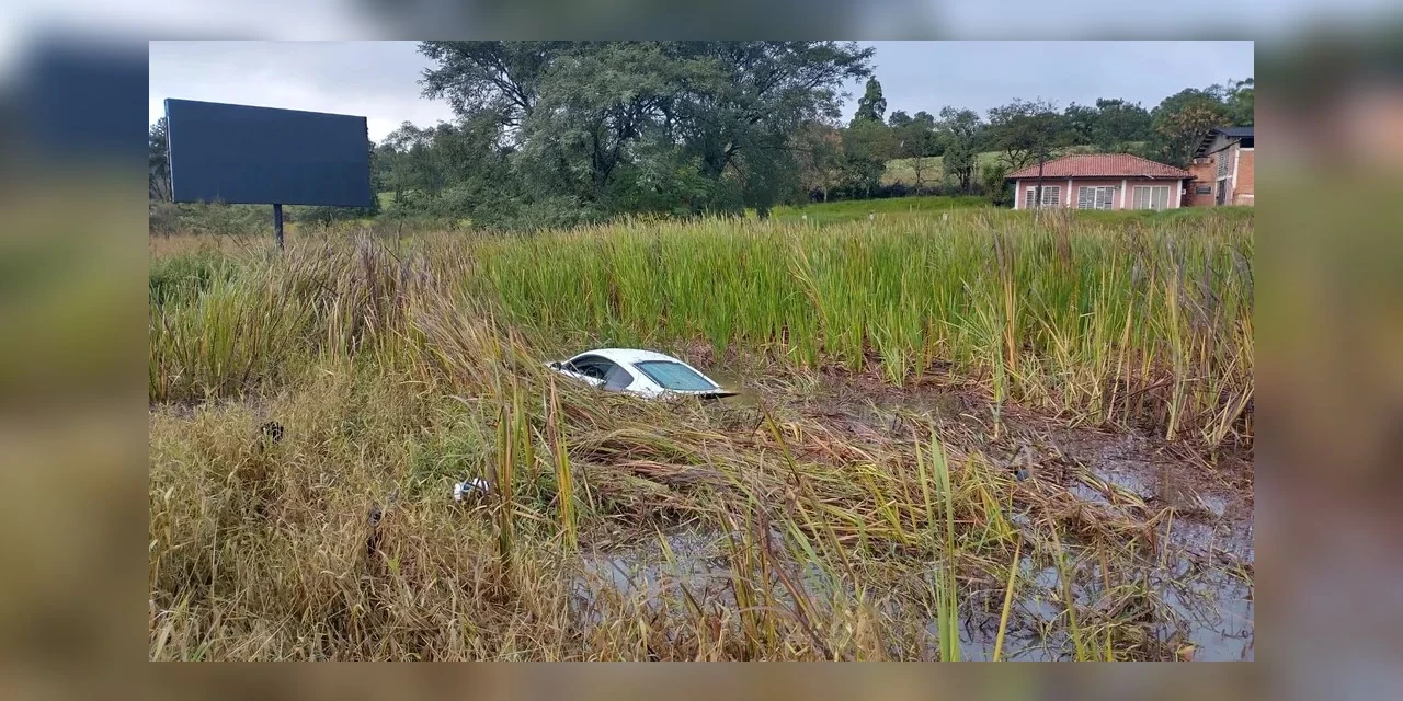 Um motorista entrou com um carro de luxo em um terreno alagado às margens da BR-376, em Ponta Grossa, nos Campos Gerais do Paraná, após perder o controle da direção e sair da pista.