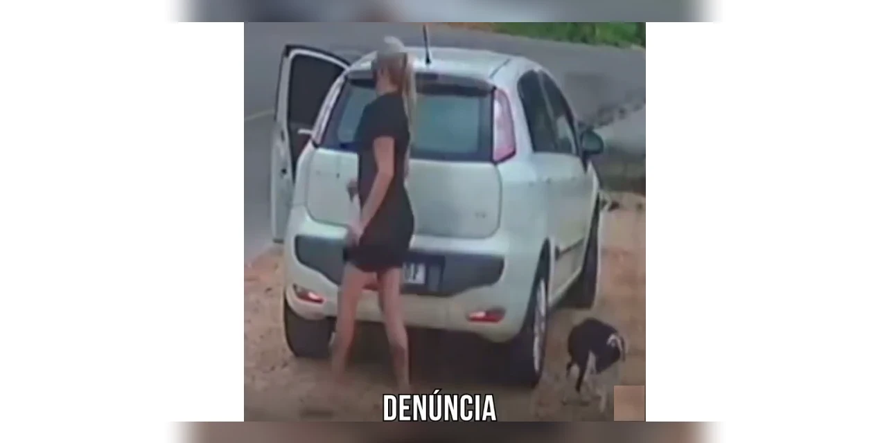 Nas imagens é possível ver quando a suspeita para o veículo, vai até o banco traseiro, tira o animal, volta para o carro e vai embora, deixando o cão sozinho.