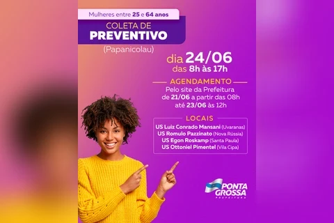 COM ASSESSORIAS - A Prefeitura de Ponta Grossa, através da Fundação Municipal de Saúde, realiza, neste sábado (24), um mutirão para a coleta de exames preventivos (Papanicolau). A ação acontece das 8h às 17h nas unidades de saúde Egon Roskamp, no Santa Paula, Luiz Conrado Mansani, em Uvaranas, Ottoniel Pimentel, na vila Cipa, e Rômulo Pazzinato,no Nova Rússia.