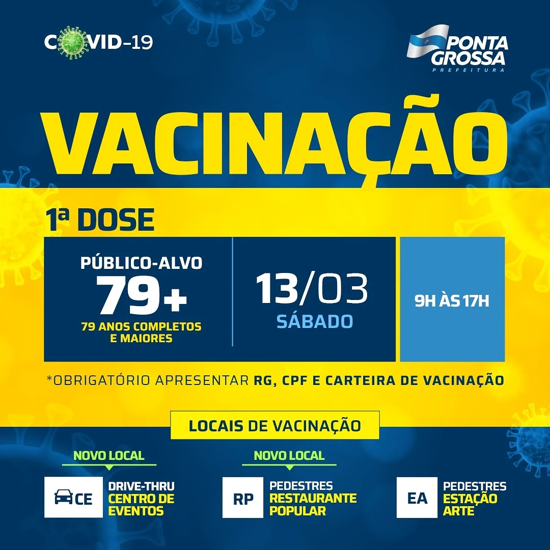 COM ASSESSORIAS - Amanhã (13) a Prefeitura Municipal de Ponta Grossa, através da Fundação de Saúde (FMS), Atenção Primária e Departamento de Imunização, realizará o segundo mutirão de vacinação contra a Covid-19.