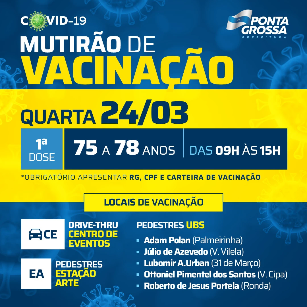 COM ASSESSORIAS - Ponta Grossa recebeu mais um lote de vacinas nesta terça-feira (23) e programou novo mutirão de vacinação amanhã (24). O público imunizado com a aplicação da primeira dose são os idosos de 75 a 78 anos que não conseguiram se imunizar no último mutirão. A Fundação Municipal de Saúde (FMS) estará disponível das 9h às 15h aplicando as vacinas em sete estruturas distribuídas pela cidade. Para público a pé terá equipe na Estação Arte e em cinco Unidades Básicas de Saúde (UBS), a população que estiver de carro deverá procurar o Centro de Eventos, através do Drive Thru.