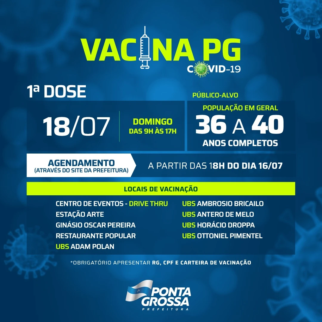 https://fms.pontagrossa.pr.gov.br/vacinacao/). O agendamento estará aberto a partir das 18h de hoje (16). A vacinação deste público necessita da apresentação do RG, CPF e carteira de vacinação.