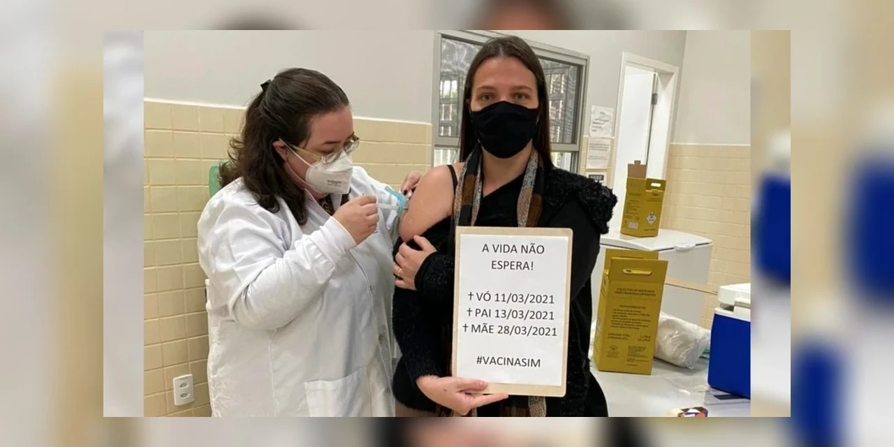 No dia de receber a primeira dose da vacina, em Ponta Grossa, nos Campos Gerais do Paraná, a paranaense levou um cartaz com o recado de que a vida não espera e, embaixo, colocou as datas de quando perdeu os familiares para a Covid.