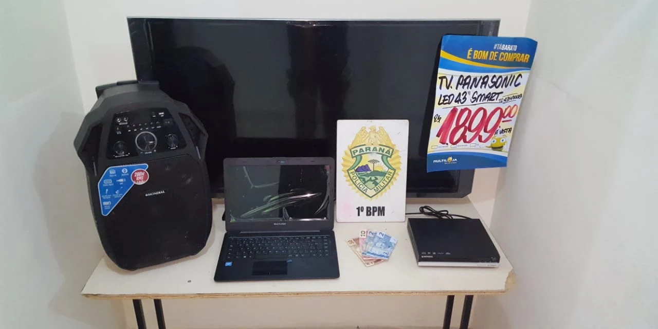 No interior do veículo estavam três homens, de 26, 35 e 39 anos, flagrados com 64 reais em dinheiro, um televisor de LCD, um DVD, um notebook e uma caixa de som, todos furtados da loja carambeiense.