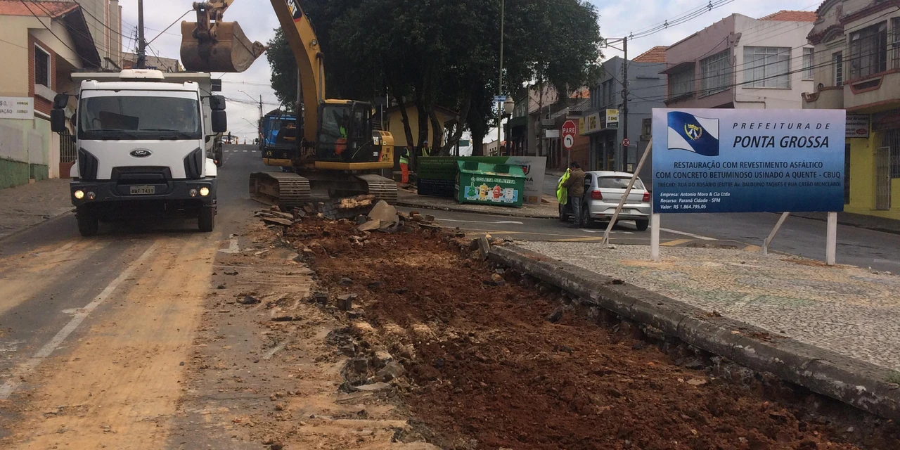 Millena Sartori e Josué Teixeira/Ponta Grossa - Foram iniciadas hoje (12) as obras de revitalização da Rua do Rosário, receberá um investimento de quase R$ 1,9 milhão no trecho entre a rua Catão Monclaro e a avenida Balduíno Taques. As máquinas estão atuando inicialmente na quadra entre as ruas Catão Monclaro e Doze de Outubro, bloqueando o trânsito naquele trecho e alterando o itinerário das linhas do transporte coletivo que passam pela região.