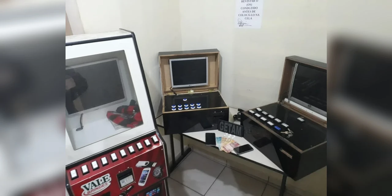 Na sequência, a equipe Getam flagrou dois indivíduos se retirando da suposta casa de jogos, onde foram localizadas 3 máquinas caça-níquel em funcionamento. Em verificação no local, também foram encontrados pelo local dois celulares abandonados, uma chave de veículo e um pino de substância análoga a cocaína. Os proprietários dos celulares que foram encaminhados a 13ª SDP para esclarecimentos e as máquinas apreendidas.