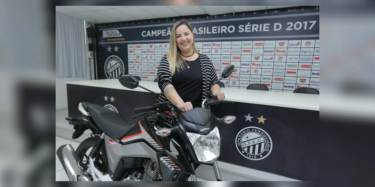 COM ASSESSORIAS - Diretores do Operário Ferroviário entregaram, no último sábado (8), o prêmio da promoção Motoqueiro Fantasma à sócia-torcedora Fernanda Moro. A ganhadora levou para casa uma motocicleta 0 KM, Honda CG 160 Titan, cor preta, 2018/2018. A promoção foi idealizada pelo diretor do programa Sócio Fantasma da Vila, Joélcio de Miranda, em parceria com o diretor de Marketing, André Bellotto, e com as Óticas Diniz.