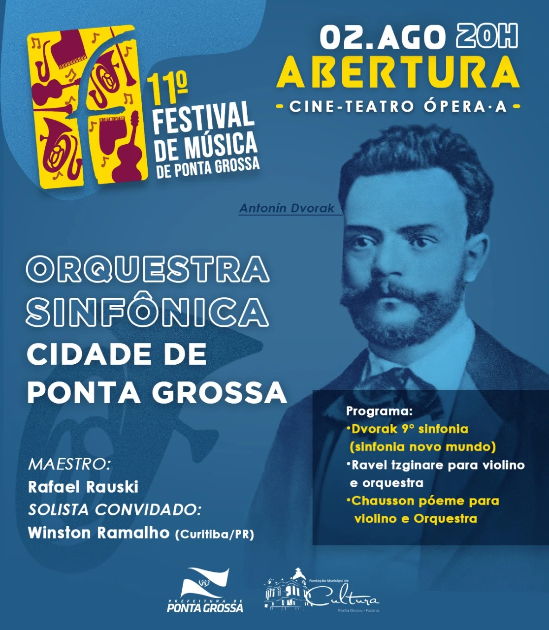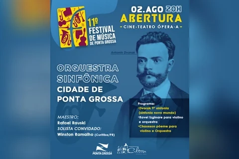 Luana Caroline Nascimento/Ponta Grossa - O 11º Festival de Música de Ponta Grossa começa oficialmente no dia 02 de agosto com um concerto da Orquestra Sinfônica Cidade de Ponta Grossa (OSPG), que receberá o prestigiado violinista Winston Ramalho, de Curitiba. A apresentação começa às 20h com entrada gratuita. Entre o repertório estará a Sinfonia Novo Mundo, do tcheco Dvořák, a peça Tzigane, de Ravel, e o Poème para Violino e Orquestra (op. 25), de Chausson.
