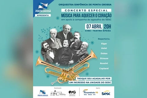 IMPRENSA/Ponta Grossa - O primeiro domingo de abril, 07, será de música e calor no Cine-Teatro Ópera. A Orquestra Sinfônica Cidade de Ponta Grossa, mantida pela Prefeitura Municipal de Ponta Grossa e pela Fundação Municipal de Cultura, com o apoio do Fecomércio PR e o SESC, irá realizar o concerto especial "Música para aquecer o coração" às 20h. O ingresso deve ser trocado por um agasalho na unidade do SESC em Ponta Grossa ou no dia 07 no hall do Cine-Teatro Ópera a partir das 18h30.
