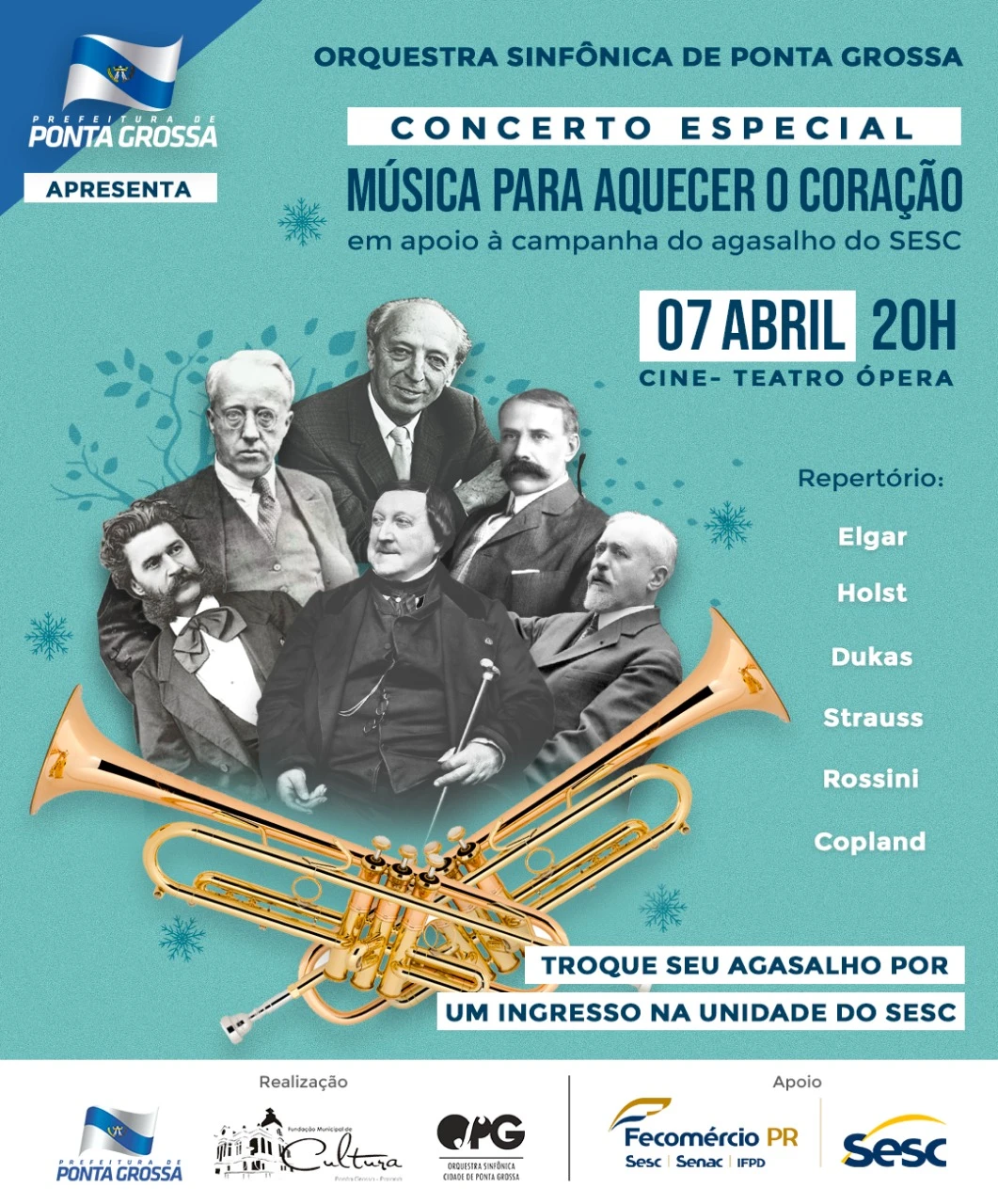 Luana Caroline Nascimento/Ponta Grossa - A Campanha do Agasalho, promovida pela Fecomércio PR – SESC/SENAC, irá começar com muita música nos Campos Gerais. A Orquestra Sinfônica Cidade de Ponta Grossa, unidade mantida pela Prefeitura de Ponta Grossa, irá realizar neste domingo, 07 de abril, às 20h, no Cine-Teatro Ópera, um concerto especial para a abertura da campanha, intitulado ‘Música para aquecer o coração’.