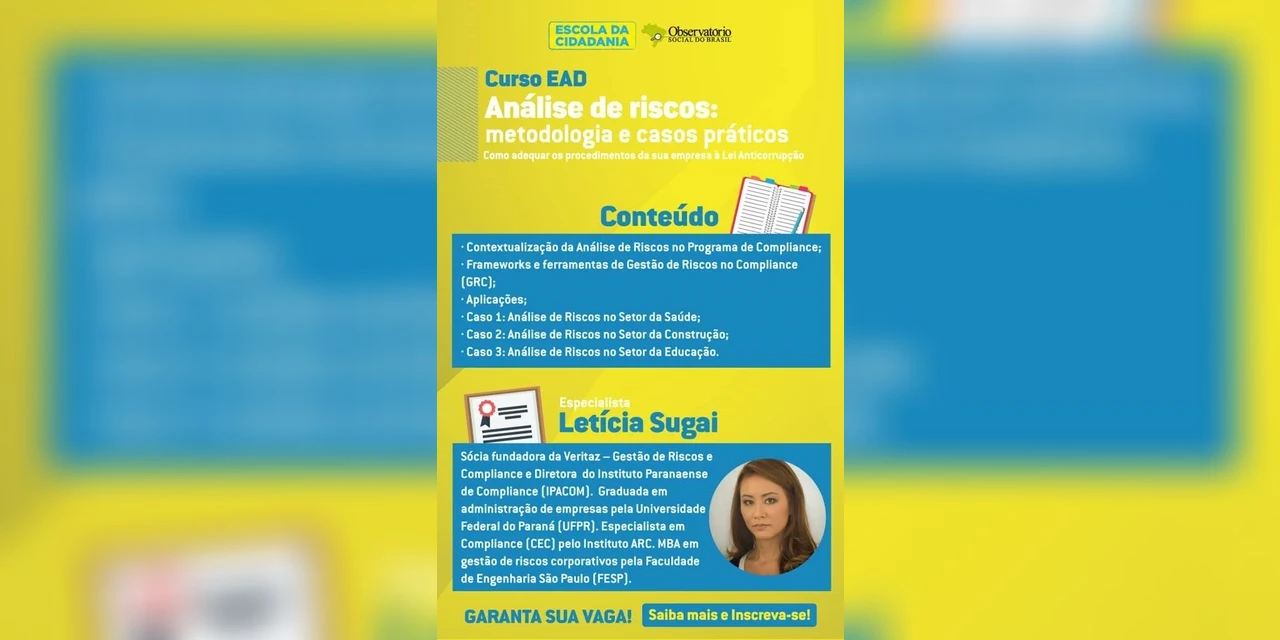 COM ASSESSORIAS - Estão abertas as inscrições para o Curso EAD “Análise de Riscos: Metodologia e Casos Práticos”, realizado pela “Escola da Cidadania” do Observatório Social do Brasil (OSB) e ministrado pela especialista Letícia Sugai. O workshop será aberto no dia 10 de outubro de 2018 (quarta-feira) e terá a duração de aproximadamente quatro horas, intercalando vídeos, aulas e atividades. Além disso, haverá um seminário de uma hora com a professora, para esclarecimentos de dúvidas e debates sobre o tema. O aluno terá o prazo de 1 mês para realizar o curso, podendo escolher o dia e horário que for mais conveniente a ele.