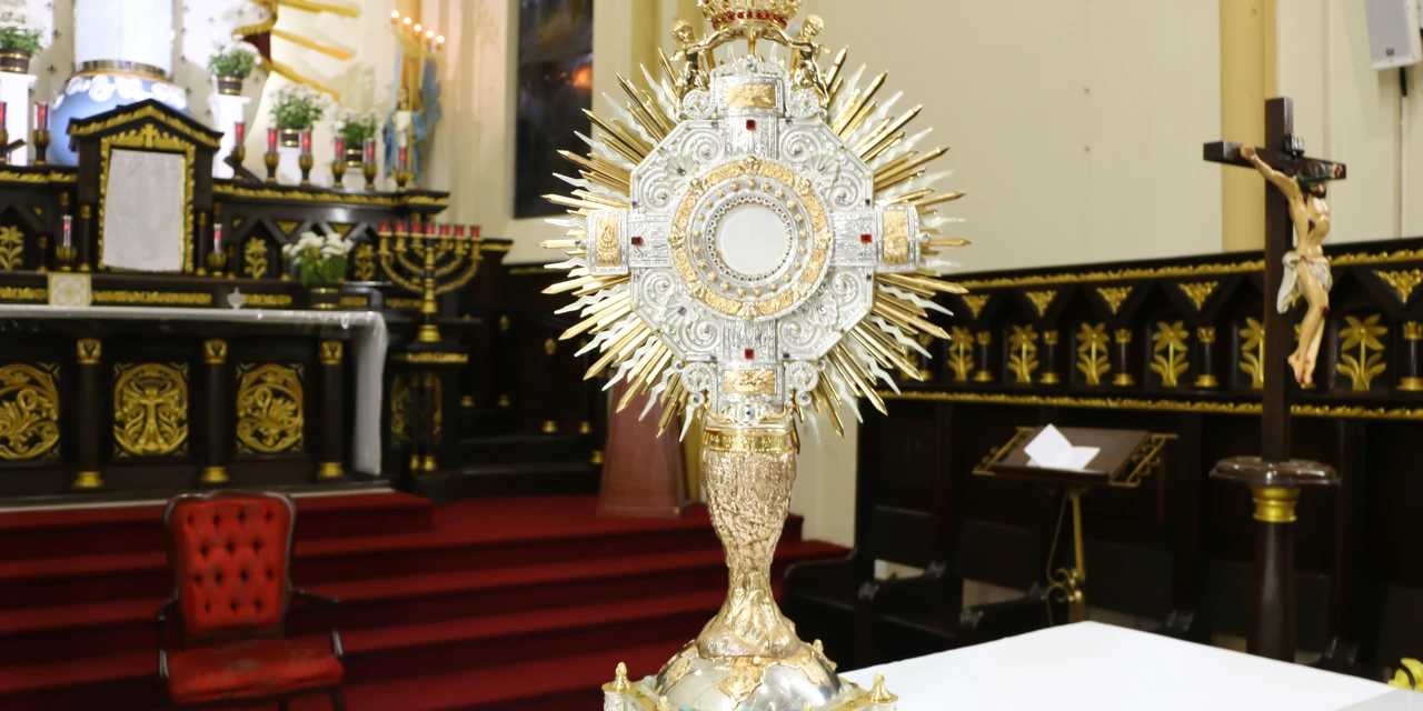 COM ASSESSORIAS - Um ostensório rico em beleza e detalhes compõe o altar da Reitoria do Sagrado Coração de Jesus, a Igreja dos Polacos, em Ponta Grossa. Por estar no altar, mais distante da nave, local onde ficam os fieis, a peça acaba não sendo admirada em todos os seus pormenores. Em metal, banhado a ouro e prata, a custódia, como é também chamada, tem um suporte no formato da Taça de Vila Velha, além de pedras cravejadas marcando a localização da cidade no mapa do Brasil e diferentes brasões. O ostensório foi presente das paróquias da Diocese ao bispo dom Antônio Mazzarotto, por seu jubileu de ouro sacerdotal e pelos 35 anos de bispado. O ostensório foi entregue ao bispo em 23 de novembro de 1964.