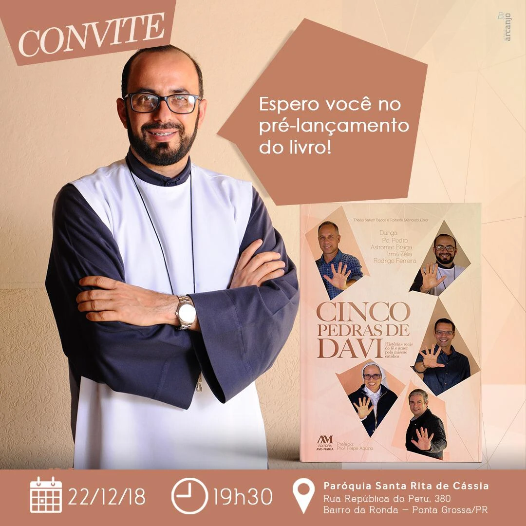 O pré-lançamento do livro acontecerá no dia 22, às 19h30, na Paróquia Santa Rita. A obra foi publicada pela Editora Ave Maria e custa, no site da editora, R$ 19,92. Conforme nota da editora, o livro oferece a oportunidade de refletir e entender o real sentido da vida, a partir do exemplo dos cinco missionários, pessoas que podem ser importantes instrumentos para a vitória que vem de Deus. “Assim como a pedra utilizada na famosa história bíblica de Davi, que apesar do tamanho, fora usada no momento oportuno pelo jovem guerreiro israelita, sendo suficiente para acertar o gigante Golias com um pequeno seixo coletado a margem do rio. Um verdadeiro conjunto de entrevistas e perfis jornalísticos sinceros sobre os quatro pilares do Catecismo da Igreja Católica: a profissão de fé, os sacramentos da fé, a vida na fé e a oração na vida da fé”, explica o resumo da obra.