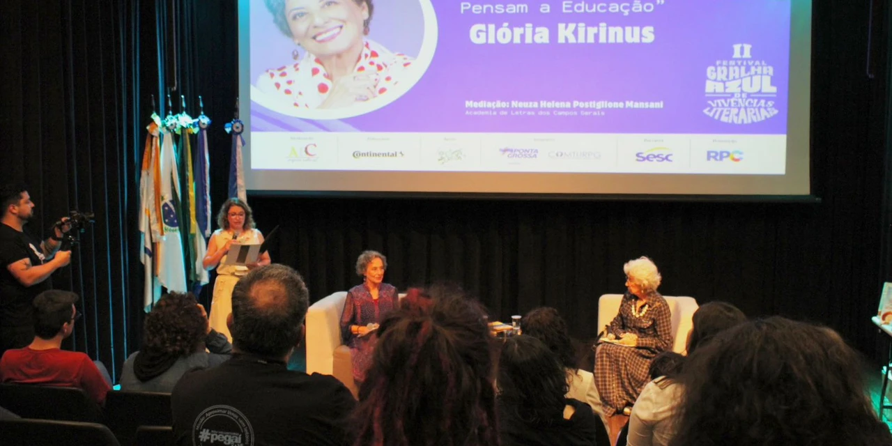 COM ASSESSORIAS - Como parte do II Festival Gralha Azul, Glória Kirinus apresentou a palestra "Quando poetas pensam a educação" na noite de ontem (11), no Sesc Estação Saudade, instituição parceira do evento. A iniciativa, promovida pela ABC Projetos Culturais, possui apoio da Lei Municipal de Eventos Geradores de Fluxo Turístico, com patrocínio da Continental do Brasil e parceria com o Sesc Estação Saudade, Academia de Letras dos Campos Gerais, RPC, Curso de Jornalismo da UEPG, através do Núcleo de Produção Audiovisual.